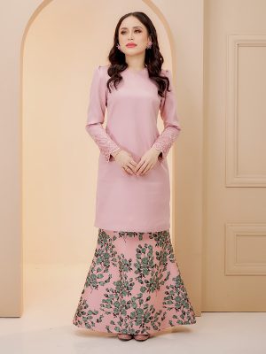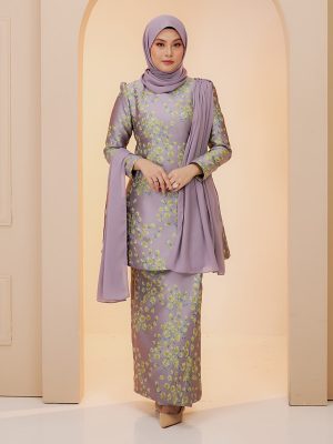 A traditional kurung with a trendy twist that features a high neckline and the long tail at the back to provide a sense of modesty and refinement. The box-pleat skirt made of brocade material, with its luxurious texture, drapes elegantly, enhancing the overall regal aura of the outfit.